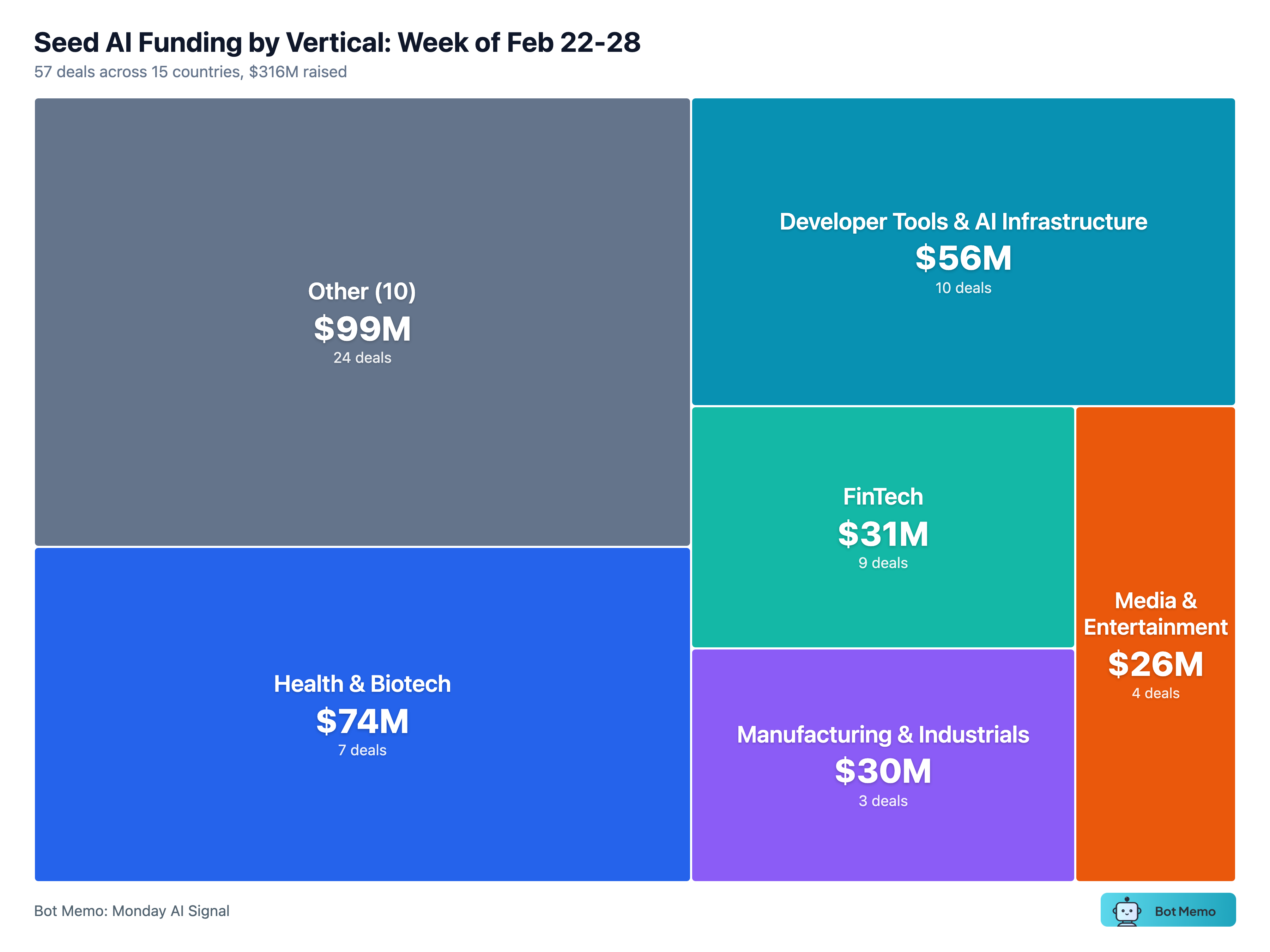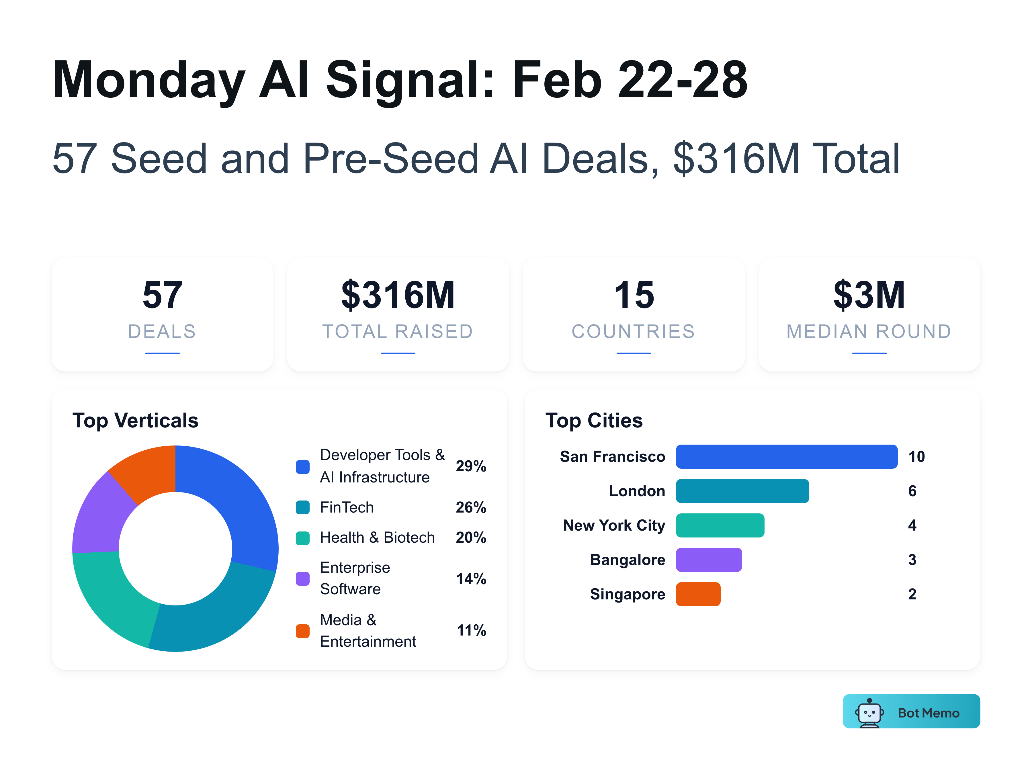 57 early stage AI deals | $316M raised | 15 countries | Median: $3M